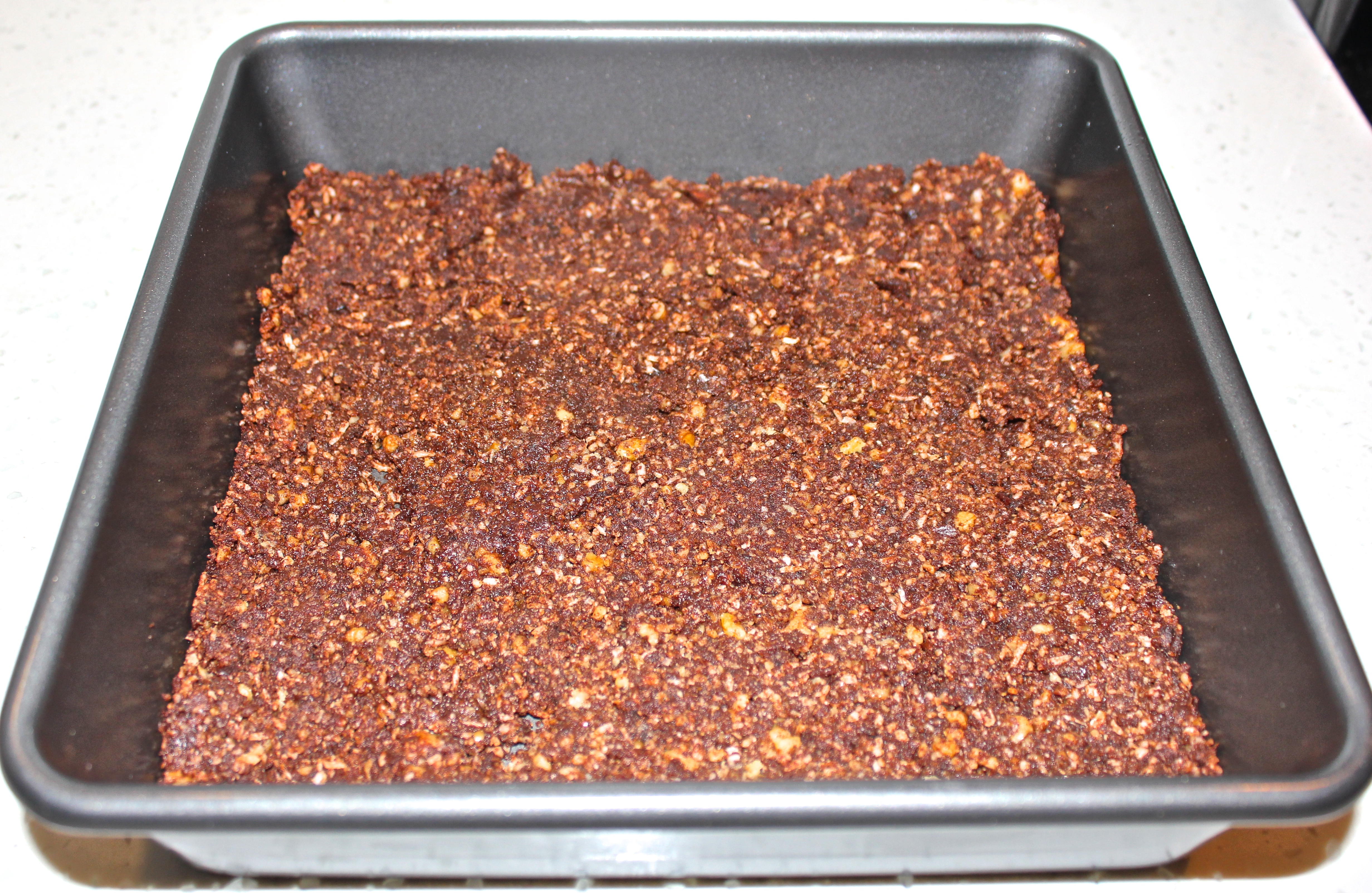 3. Line a 6 x 6-inch square pan with parchment paper (I used a 9×9 which worked just as well). Dump the base into the pan and press it down as evenly as you can.base